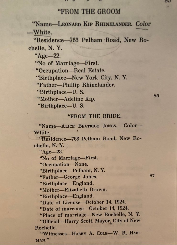Two witnesses appeared for the couple, Mr. Harry A. Cole and Mr. W.R. Harman. The bride and the groom provided the same address as their residence for the marriage license. This address (763 Pelham Road, New Rochelle) was the home of the bride’s parents, and for a short while it would be the home of the newly married Mr. and Mrs. Leonard K. Rhinelander. The couple had become acquainted on the streets of New Rochelle only three years earlier in September of 1921.